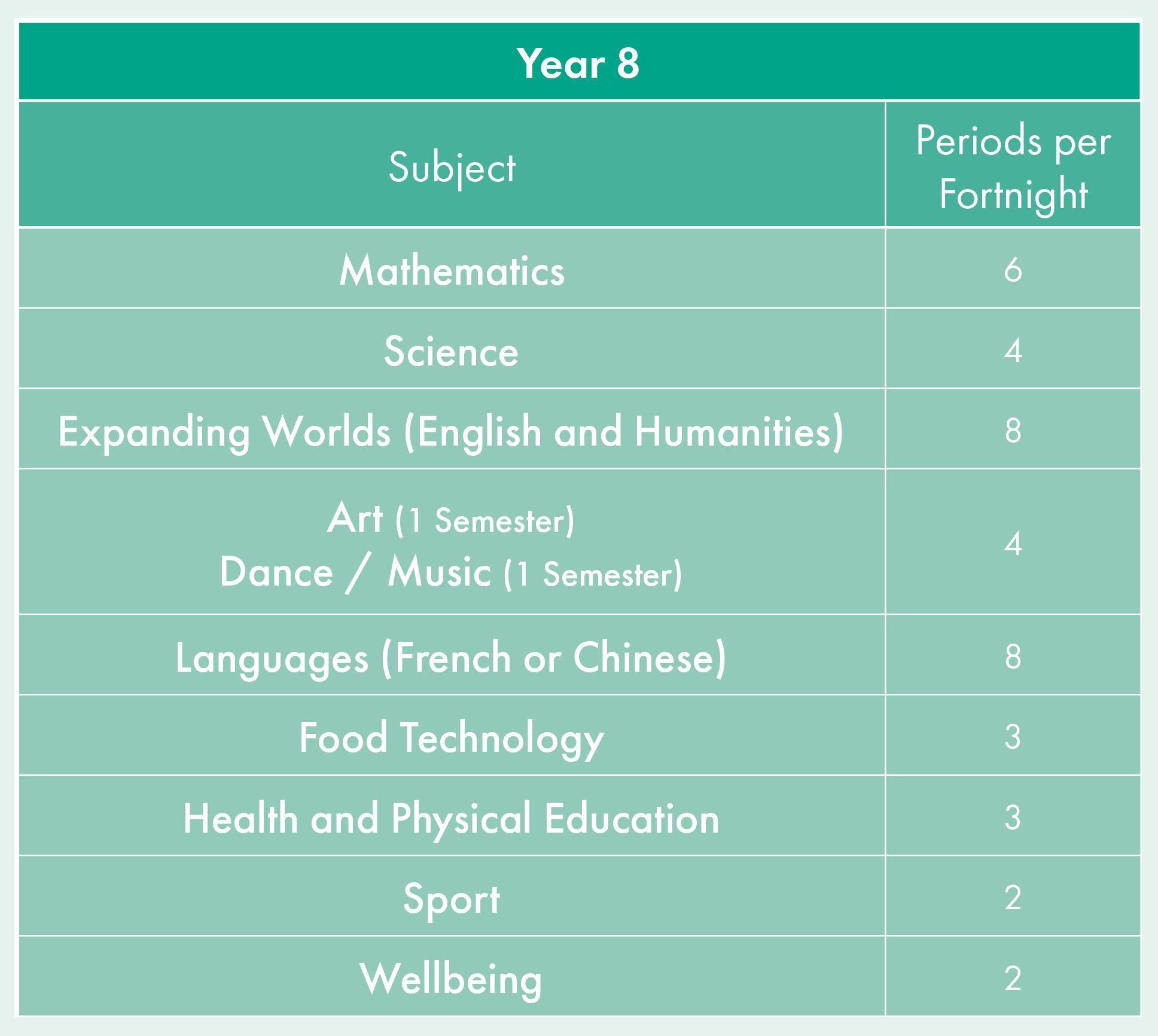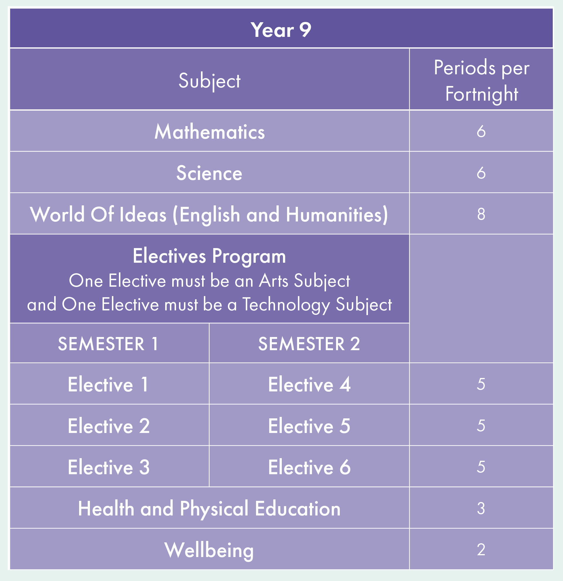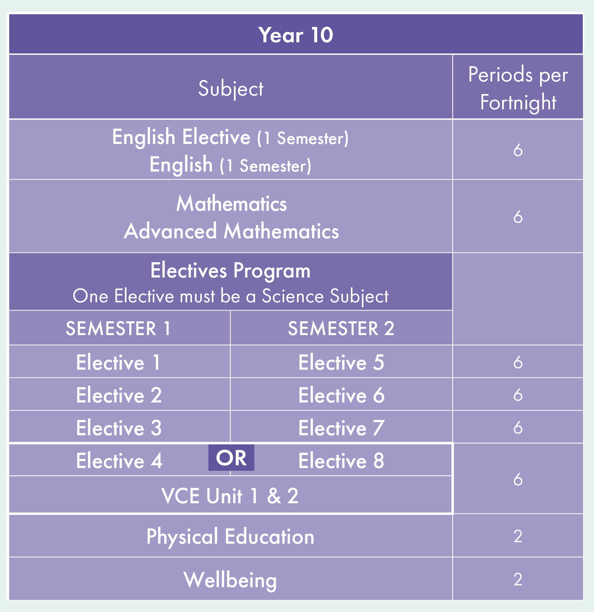 Our core curriculum is complemented by an extensive elective program from Year 8. Students who have demonstrated appropriate readiness in their Year 9 studies are also encouraged to include a VCE subject as part of their Year 10 program.