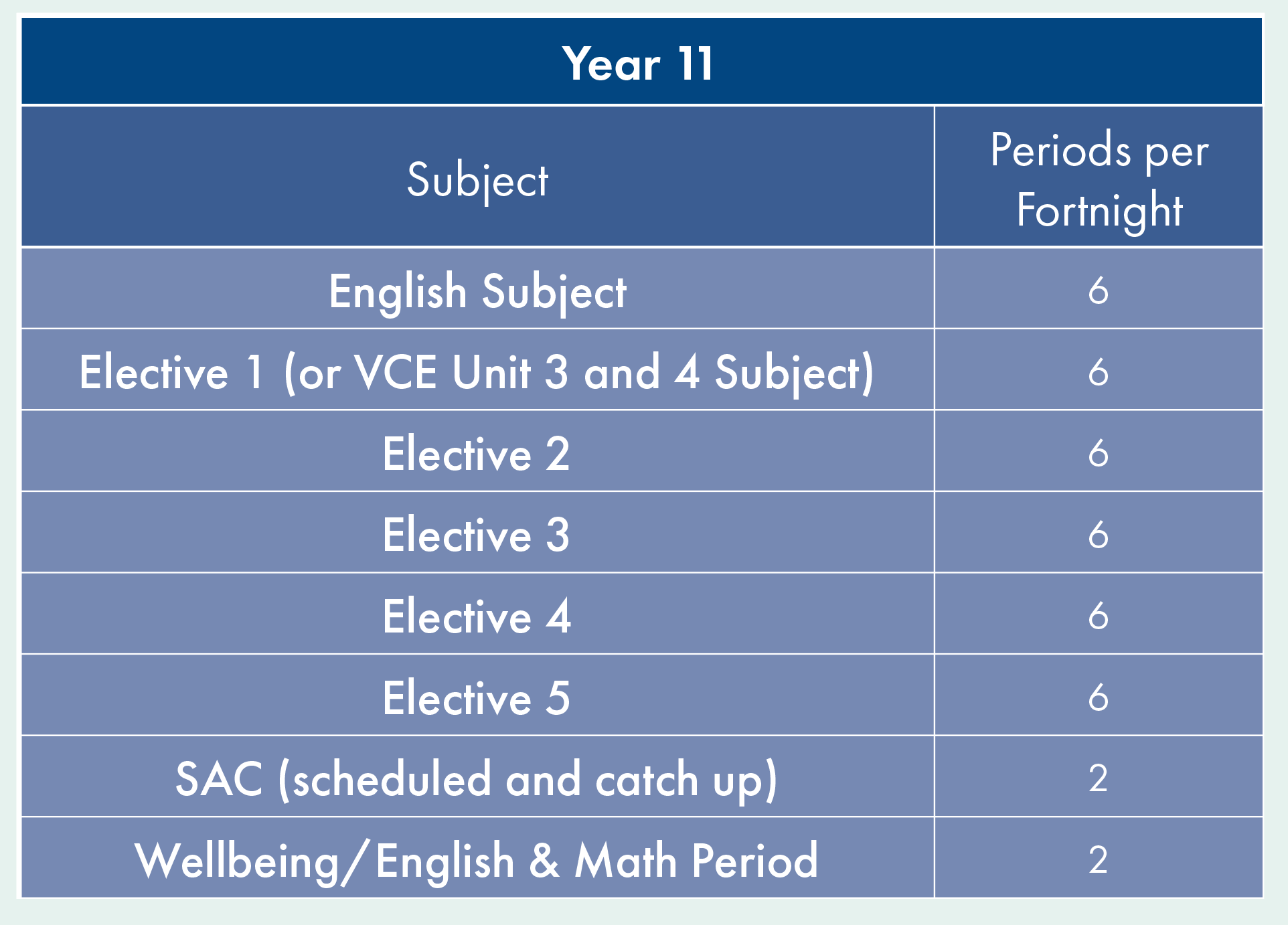 The College offers an extensive range of Victorian Curriculum and Assessment Authority (VCAA) subjects in Years 11 and 12, including the Vocational Major, a Victorian Certificate of Education (VCE) exemplary program that provides pathways to further vocational studies.